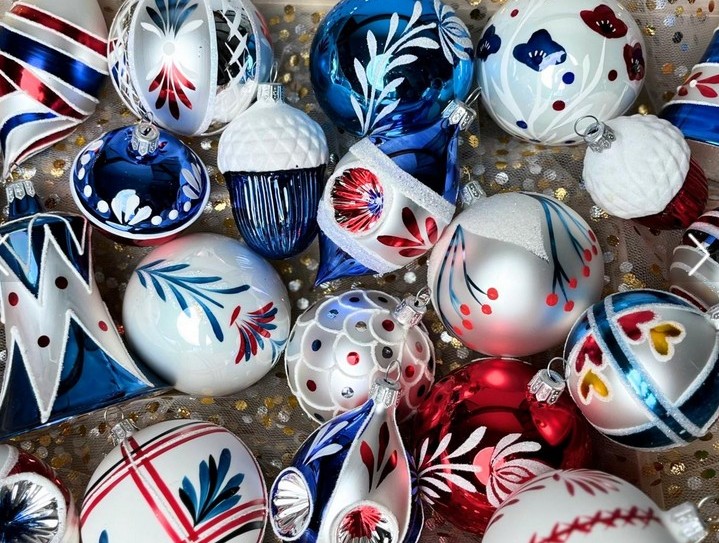 Na bílém základu rozkvétají folklorní kvítka, puntíky, srdíčka a motivy připomínající výšivku. Každá ozdoba vypráví příběh domova, klidu a poctivosti. Můžete si tak na stromeček pověsit baňky s lipnicí, červenými a modrými máky, jeřabinou či motivem husarské stuhy.