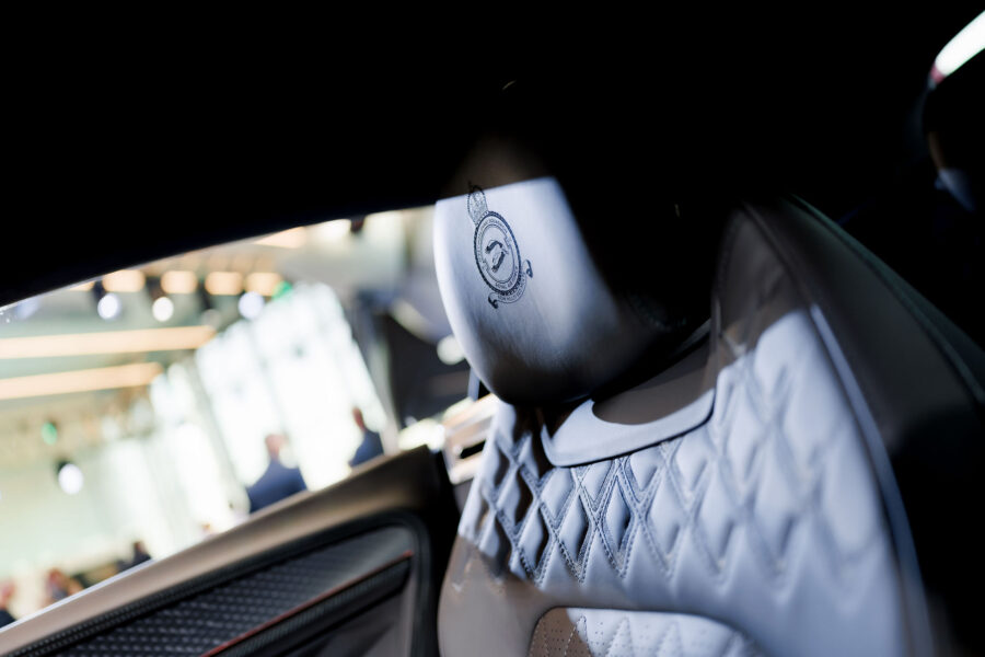Interiér je vyveden v barevném provedení na míru, které kombinuje sekundární kůži v odstínu Imperial Blue, hlavní kůži v odstínu Cognac a akcenty v odstínu Brunel. Spodní panely loketních opěrek a opěradla sedadel jsou potaženy uhlově šedým tvídem s motivem rybí kosti, zatímco jasně zbarvená konzole navazuje na „technický“ designový styl a působivě předvádí řemeslné dovednosti společnosti Mulliner.